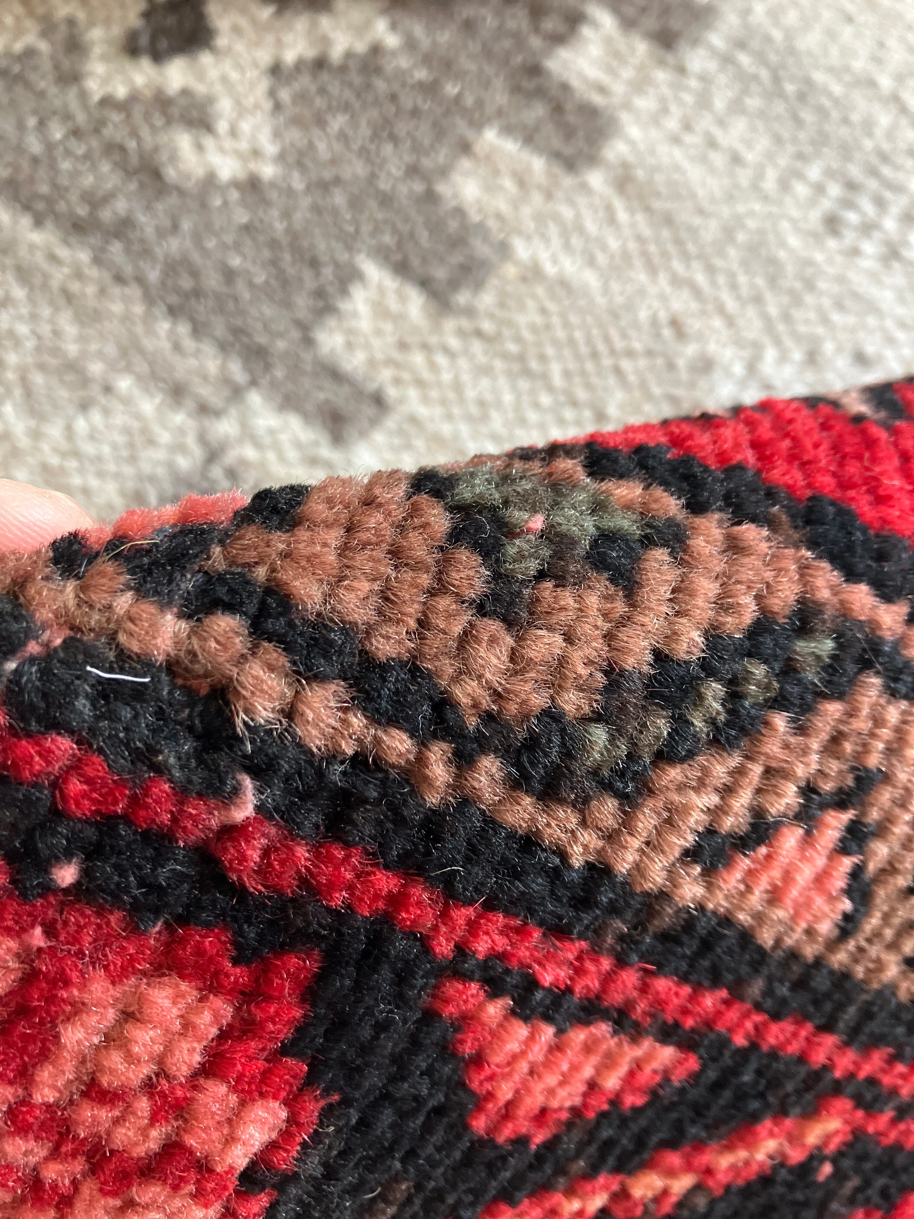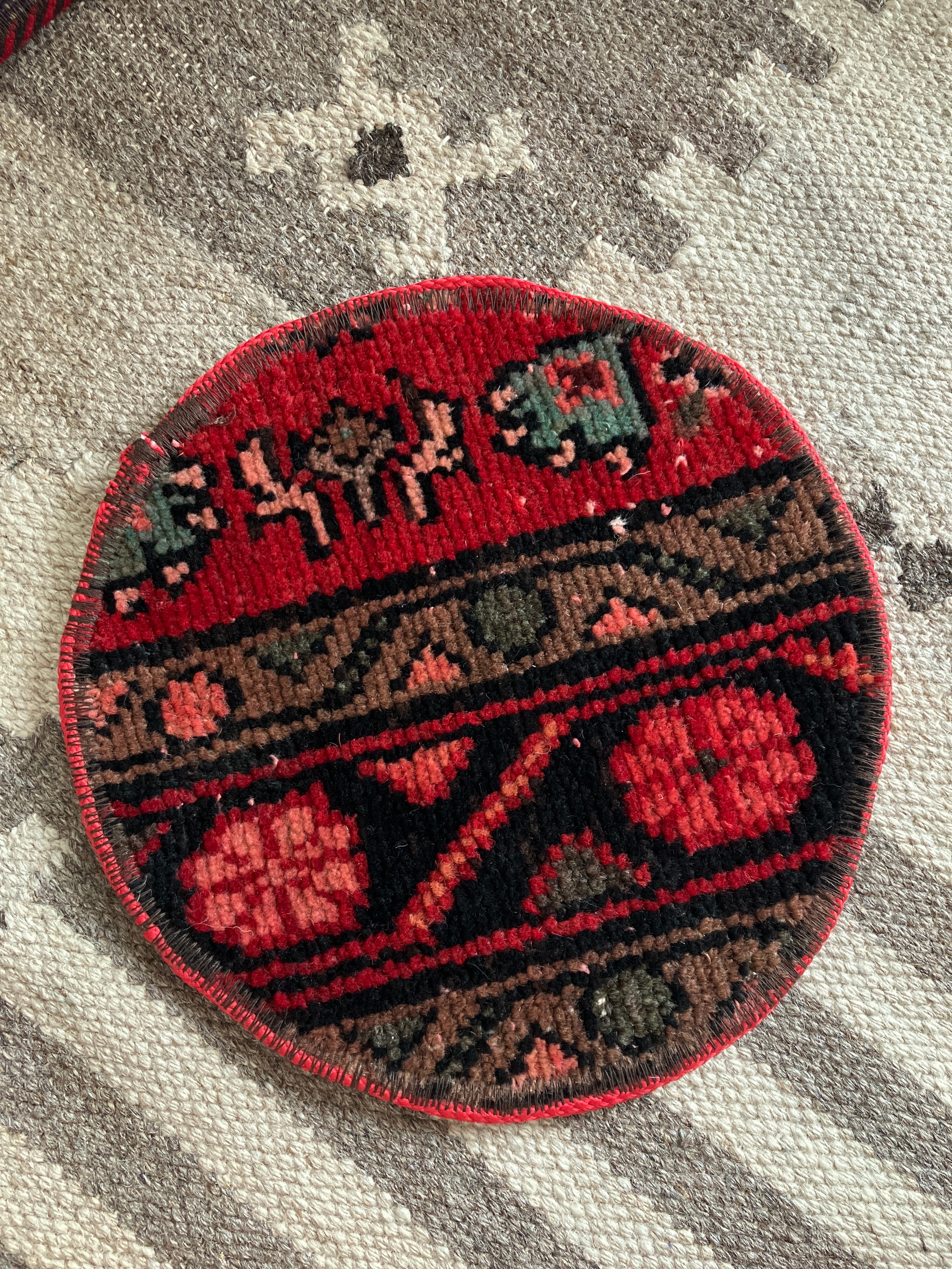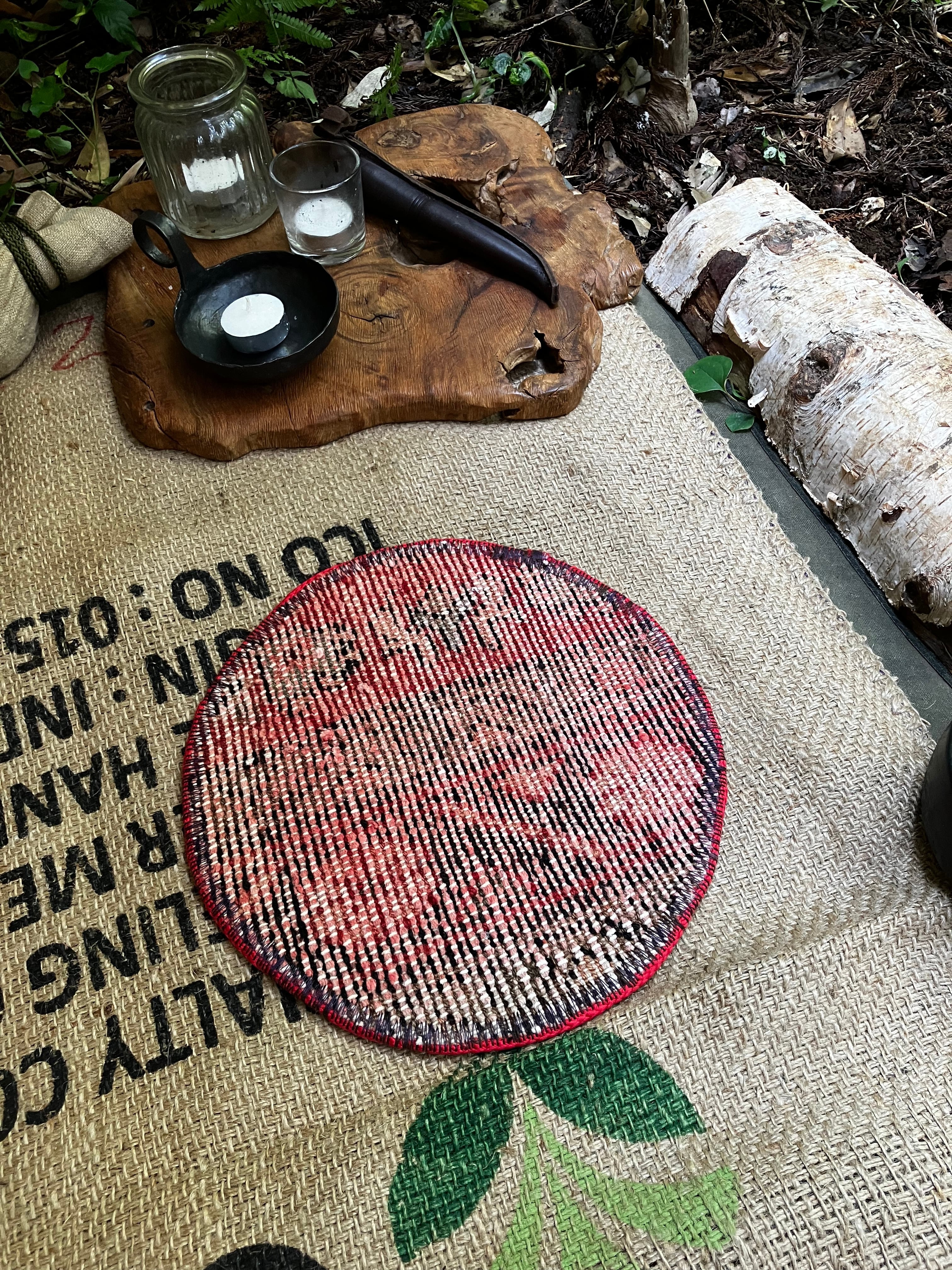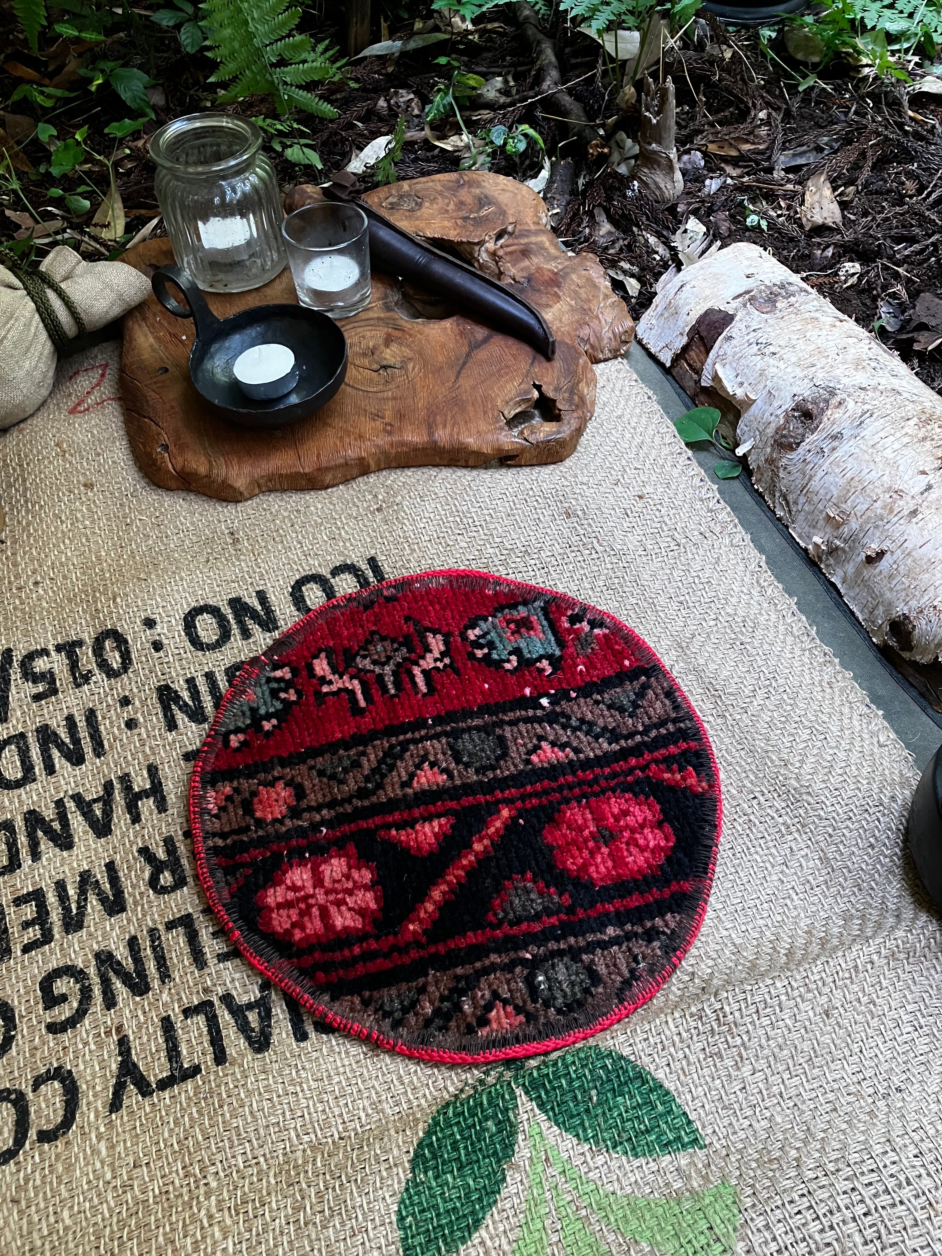 古いトライバルラグをポットマットに