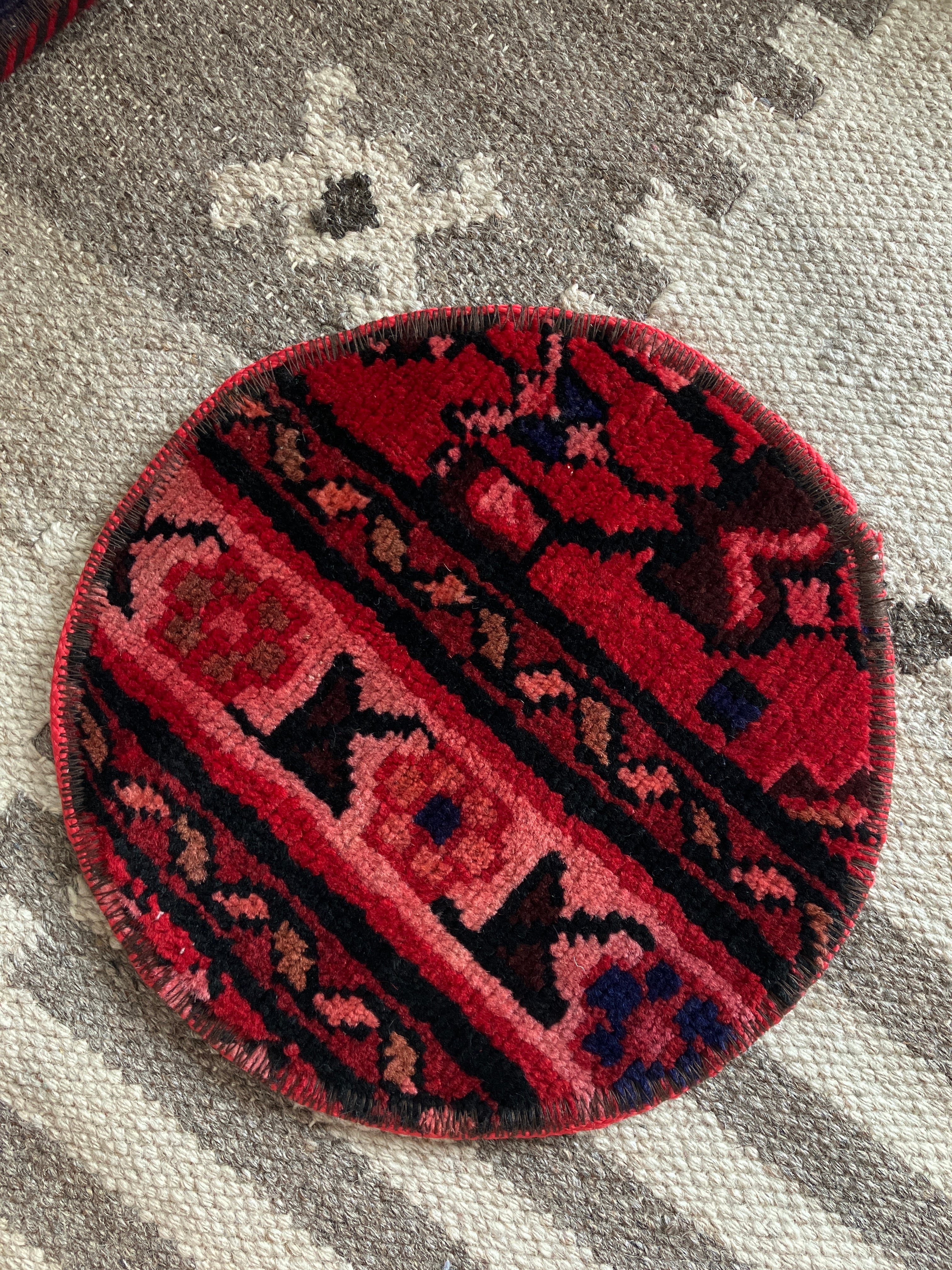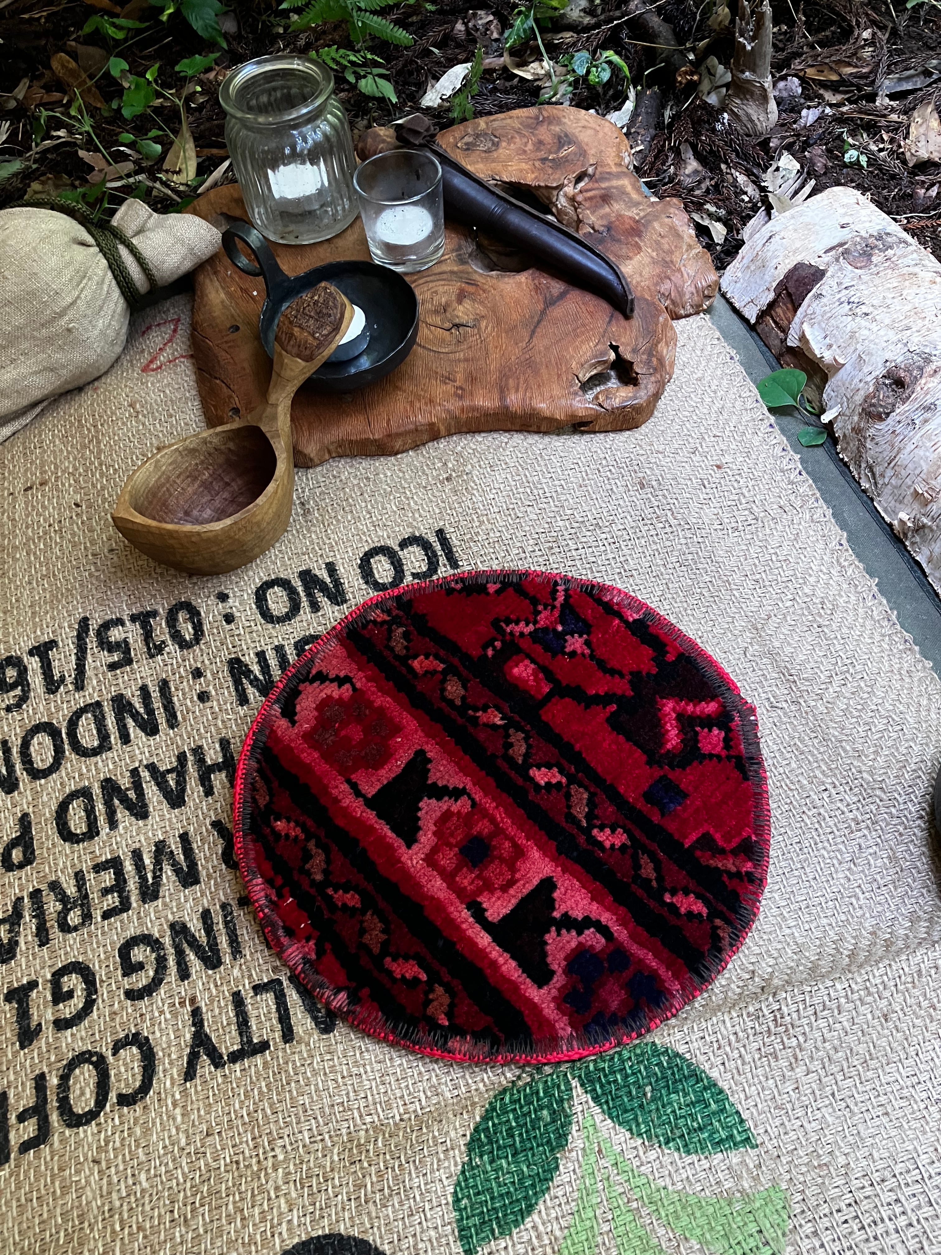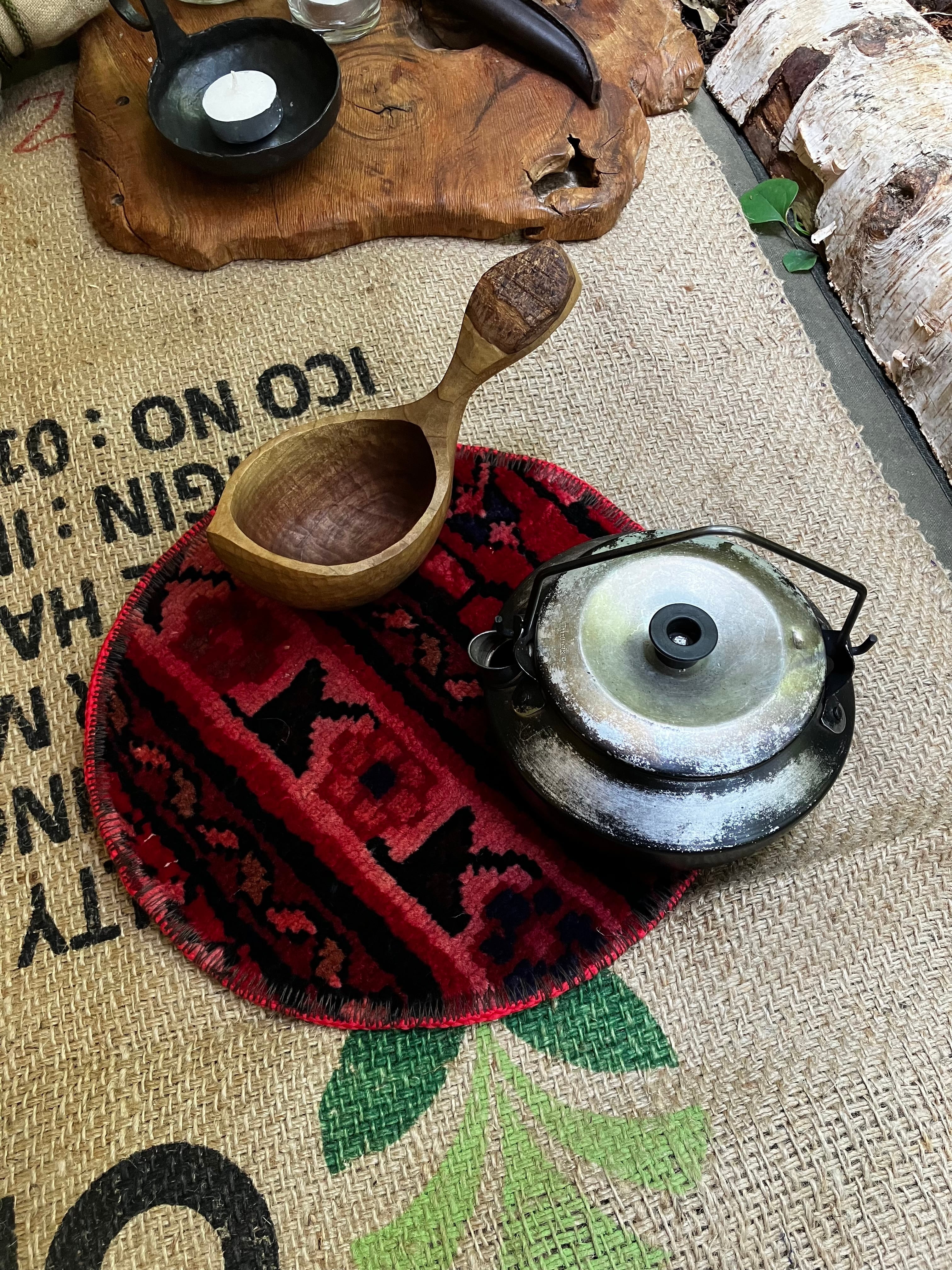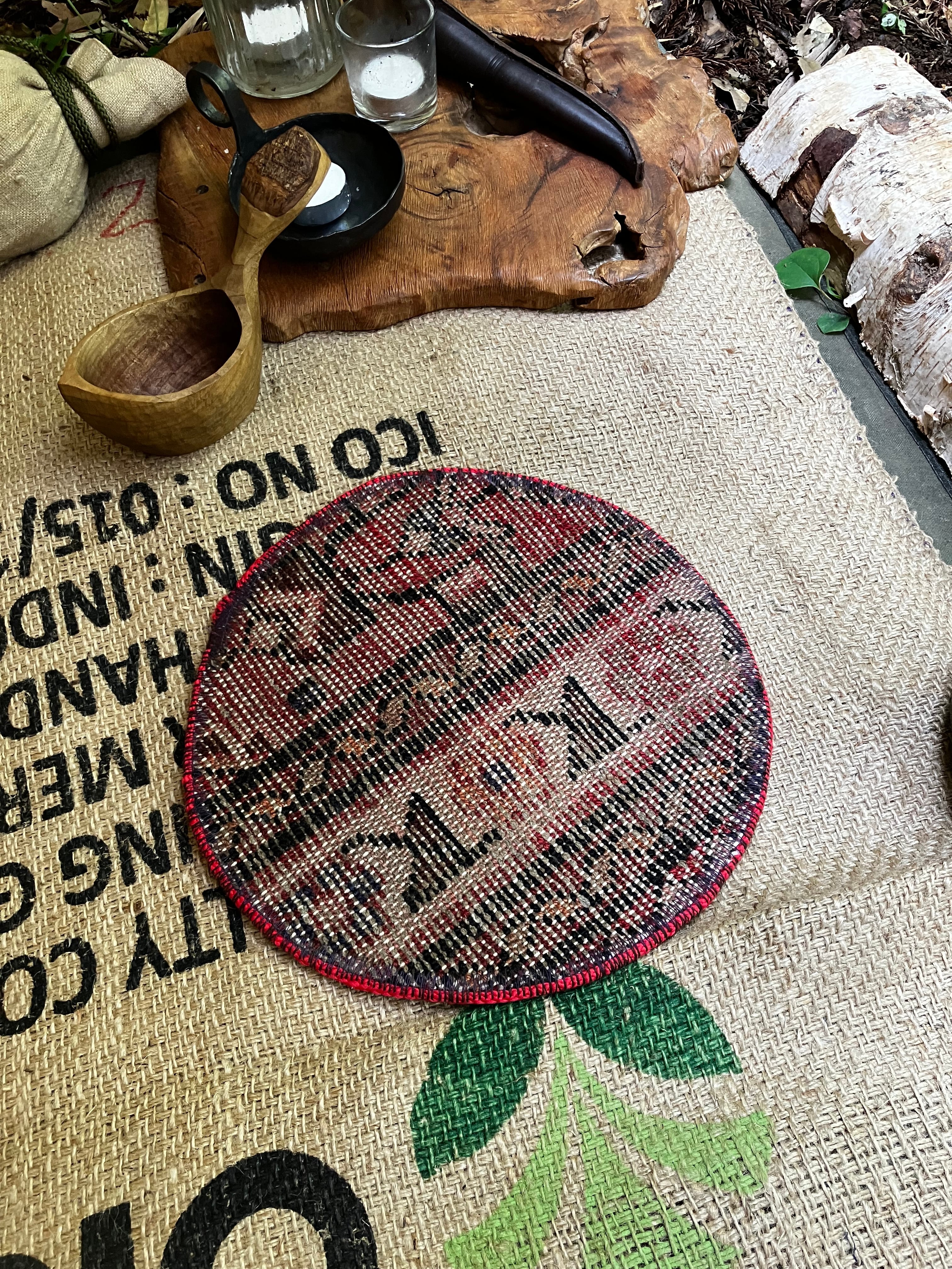 古いトライバルラグをポットマットに